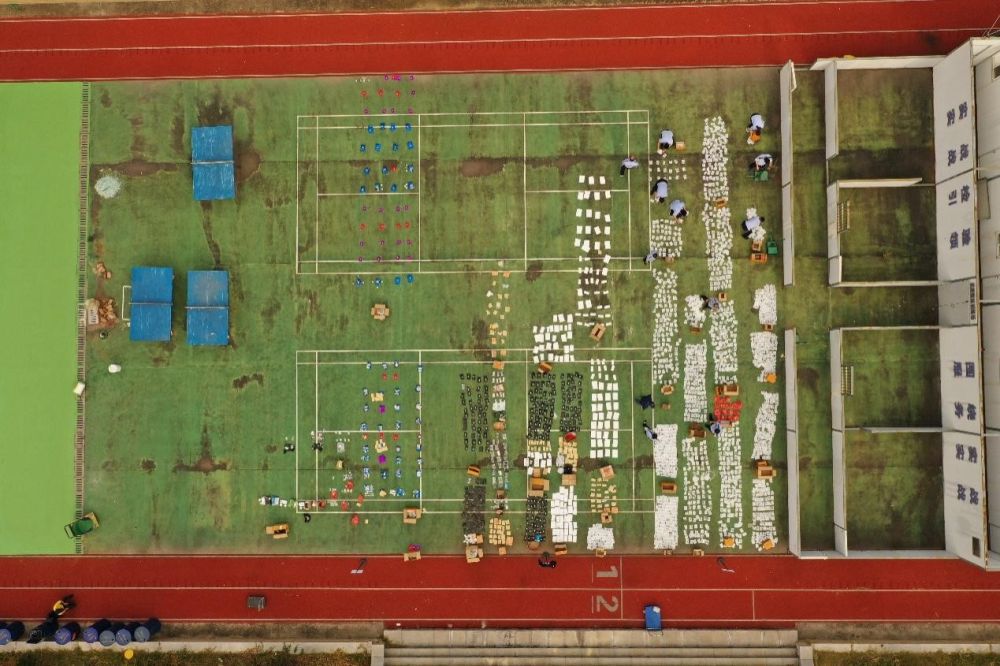 含山县公安局在“11·18”特大妨害信用卡管理案查获的银行卡“四件套”铺满半个操场。(含山县公安局供图)