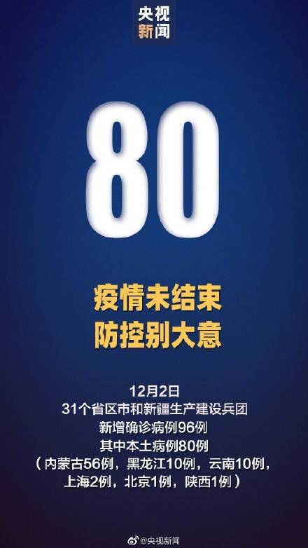 【#31省区市增80例本土确诊# #内蒙古增56例本土确诊#】12月2日0—24时,31个省(自治区、直辖市)和新疆生产建设兵团报告新增确诊病例96例。其中境外输入病例16例(上海6例,广西4例,广东3例,北京2例,天津1例);本土病例80例(内蒙古56例,均在呼伦贝尔市;黑龙江10例,均在哈尔滨市;云南10例,均在德宏傣族景颇族自治州;上海2例,均在浦东新区;北京1例,在海淀区;陕西1例,在咸阳市)。无新增死亡病例。新增疑似病例3例,均为境外输入病例(均在上海)。