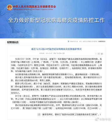截至12月2日24时,据31个省(自治区、直辖市)和新疆生产建设兵团报告,现有确诊病例972例(其中重症病例10例),累计治愈出院病例93385例,累计死亡病例4636例,累计报告确诊病例98993例,现有疑似病例5例。累计追踪到密切接触者1332534人,尚在医学观察的密切接触者32320人。