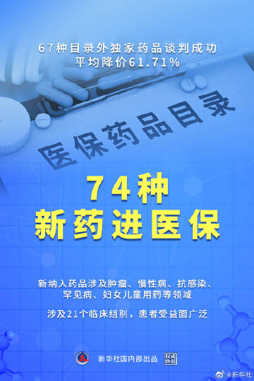 【权威快报丨2021年医保谈判结果出炉!#74种新药进入最新版医保药品目录#】国家医保局3日公布2021年国家医保药品目录调整结果,本次调整后,74种新药进入医保药品目录,11种药品被调出目录,67种目录外独家药品谈判成功,平均降价61.71%。本次调整后,#最新版国家医保药品目录药品总数达2860种#。(记者彭韵佳、沐铁城,海报设计杨轶群)