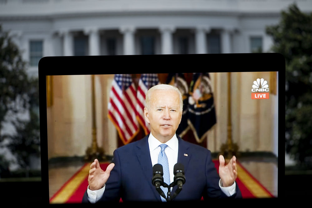 8月31日拍摄的屏幕显示的是美国总统拜登在华盛顿白宫发表讲话。(新华社记者刘杰摄)