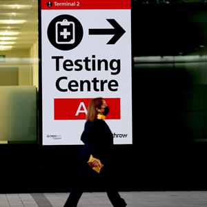 11月30日,一名行人经过英国伦敦希思罗机场内的检测中心指示牌。(新华社记者李颖摄)
