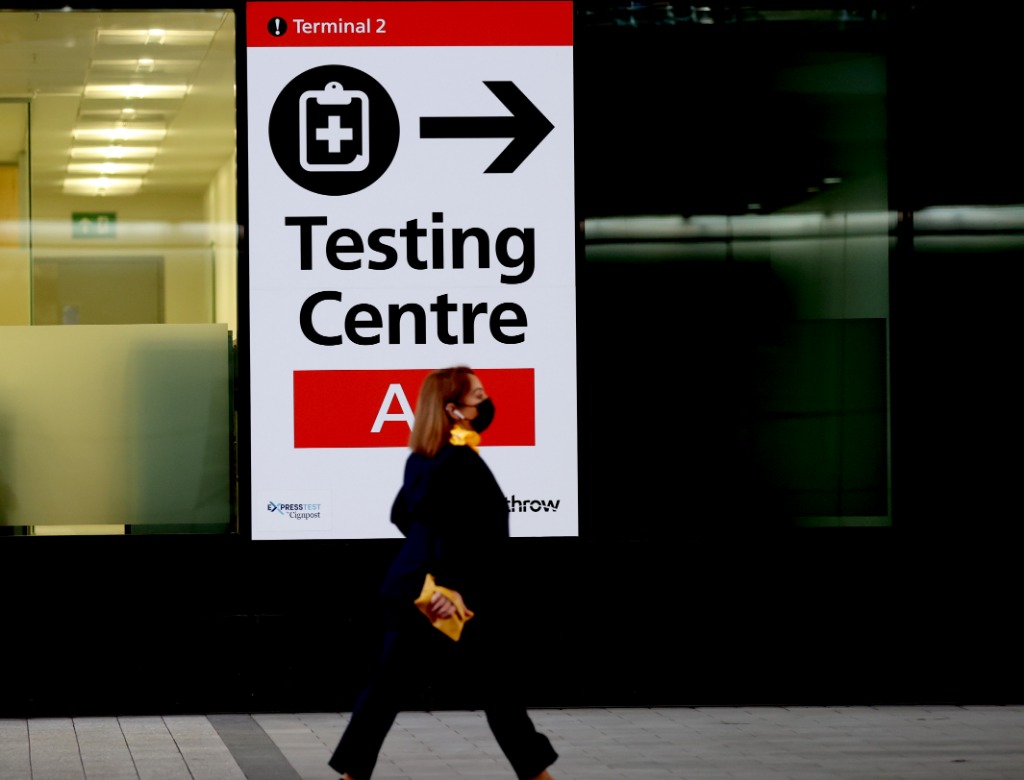11月30日,一名行人经过英国伦敦希思罗机场内的检测中心指示牌。(新华社记者李颖摄)