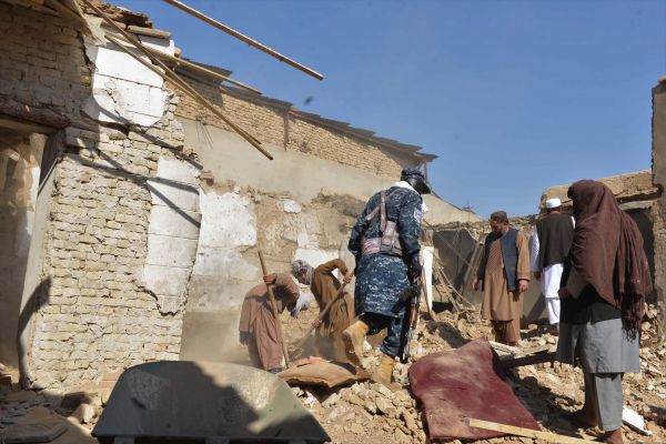 11月15日,在阿富汗坎大哈,人们查看打击“伊斯兰国”武装分子行动后受损的房屋。 新华社发