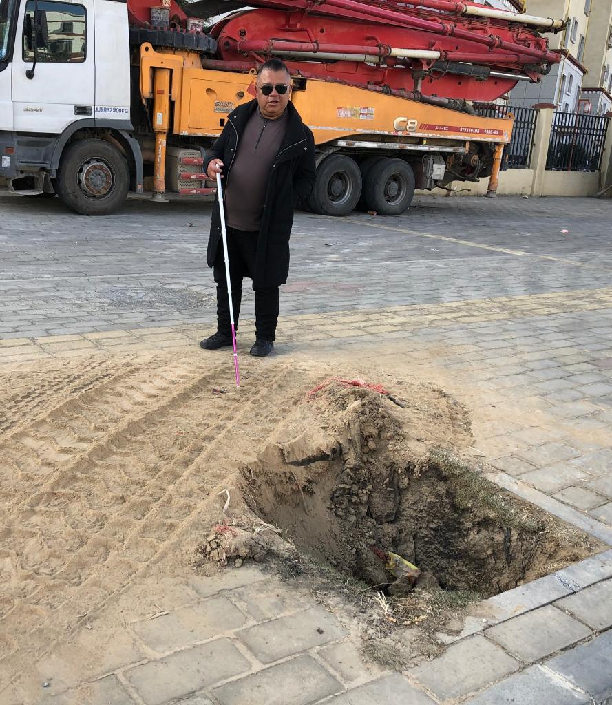 刚踏上盲道,斯勇身旁就有一个绿化树木被挖掉后形成的大坑,前方一处突起的井盖覆盖了一半盲道,而斯勇只能用盲杖去探测这些障碍物。“全凭我的经验去猜测大概是什么东西,心里有数才不会被绊倒。最难的是商铺前的电瓶车充电线,这个很难探测到,容易被绊倒。”斯勇说。