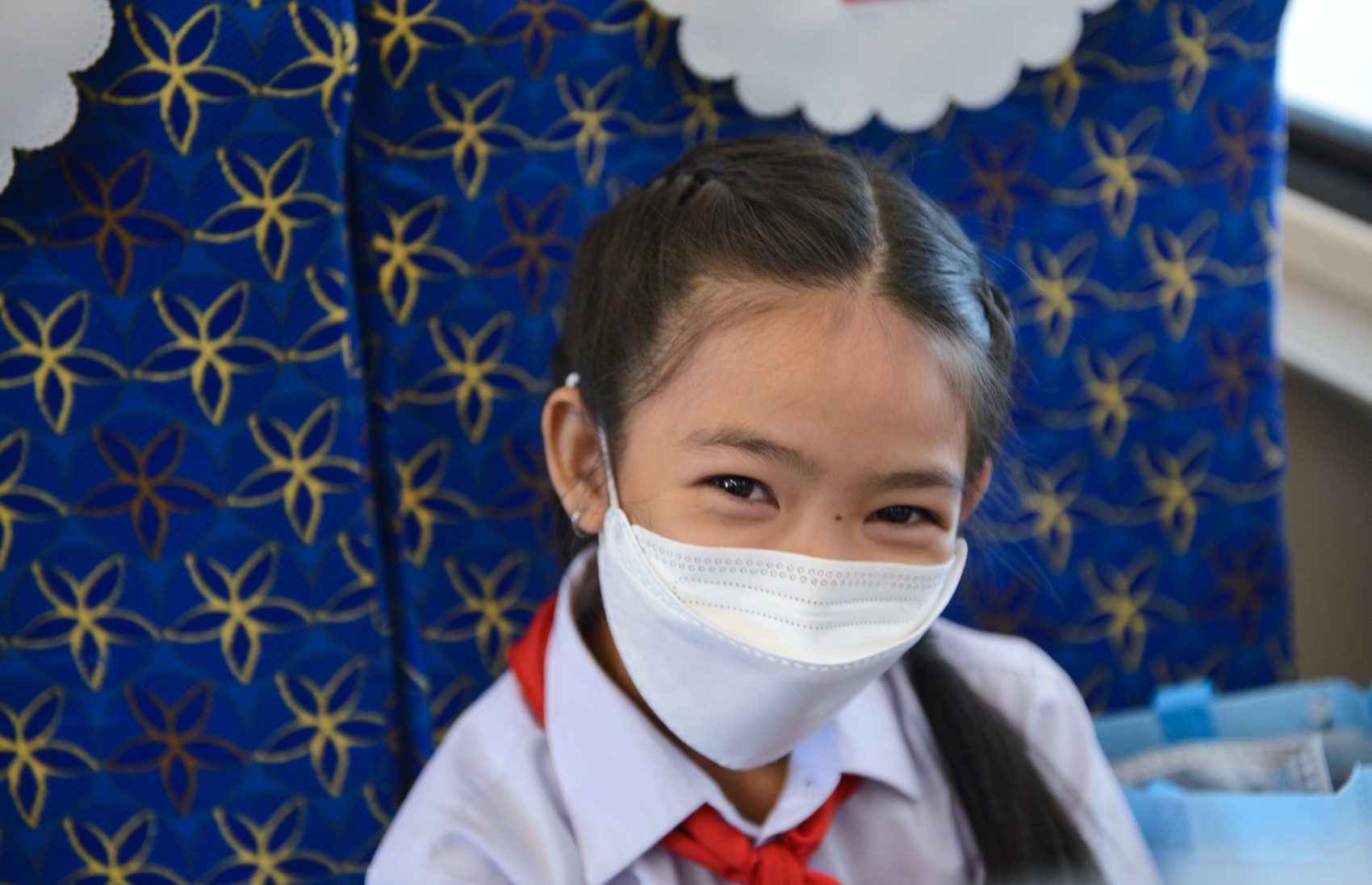 12月3日,老挝中老友好农冰村小学学生乘坐从万象始发的“澜沧号”动车组列车。新华社发(刘艾伦摄)