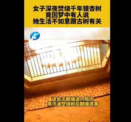 ·荒唐!河南一女子两次火烧千年银杏树竟因一个梦,目前该名女子已被刑事拘留。