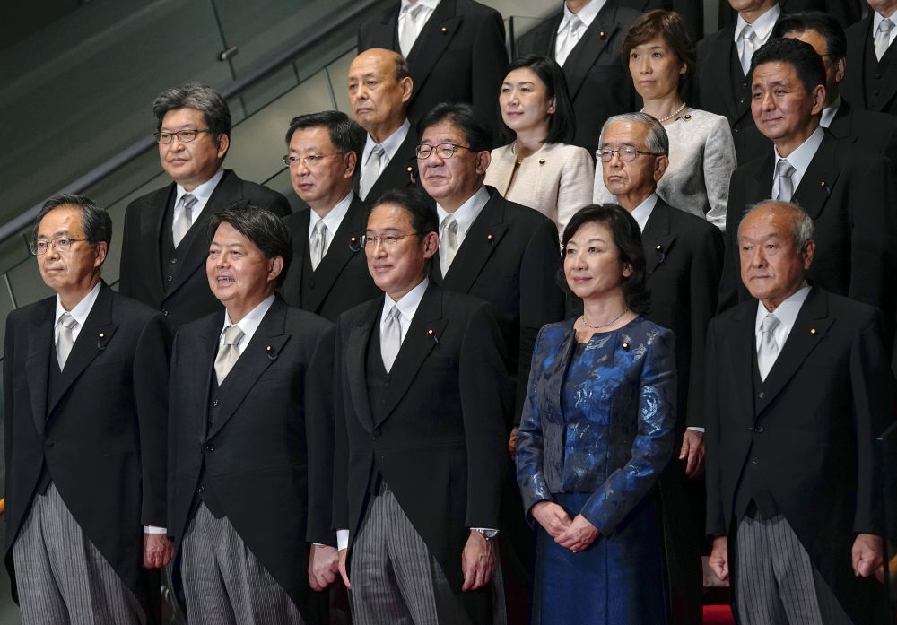 11月10日,日本自民党总裁岸田文雄经国会众参两院首相指名选举当选日本第101任首相。图为岸田(前排中)在东京首相官邸率阁僚合影,其中包括新任外相林芳正(前排左二)。(新华社发,Pool图片,间山公雅摄)