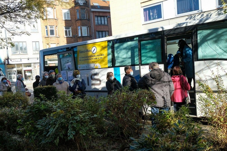 11月9日,人们在比利时布鲁塞尔一辆“疫苗巴士”前排队接种新冠疫苗。(新华社记者张铖摄)