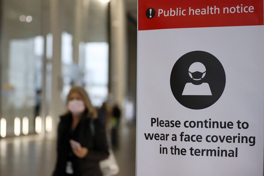 11月30日,一名旅客经过英国伦敦希思罗机场内的防疫告示。(新华社记者李颖摄)
