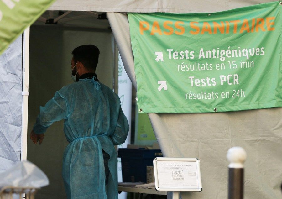 11月9日,工作人员在法国巴黎街头一处新冠病毒检测点忙碌。(新华社记者高静摄)