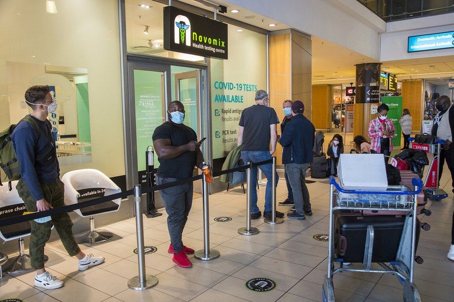 11月29日,旅客在南非开普敦国际机场等待接受新冠病毒检测。(新华社发,弗克摄)