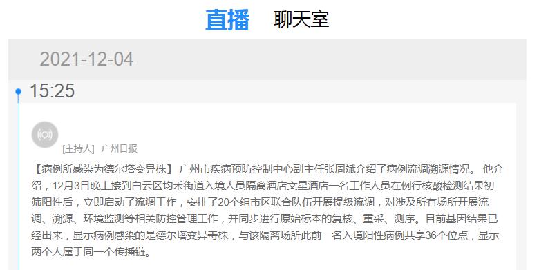 据广州日报消息,12月4日,广州市举行新闻发布会,通报新冠疫情防控工作相关情况。发布会上获悉,广州市疾病预防控制中心副主任张周斌介绍了病例流调溯源情况。 他介绍,12月3日晚上接到白云区均禾街道入境人员隔离酒店文星酒店一名工作人员在例行核酸检测结果初筛阳性后,立即启动了流调工作,安排了20个组市区联合队伍开展提级流调,对涉及所有场所开展流调、溯源、环境监测等相关防控管理工作,并同步进行原始标本的复核、重采、测序。目前基因结果已经出来,显示病例感染的是德尔塔变异毒株,与该隔离场所此前一名入境阳性病例共享36个位点,显示两个人属于同一个传播链。