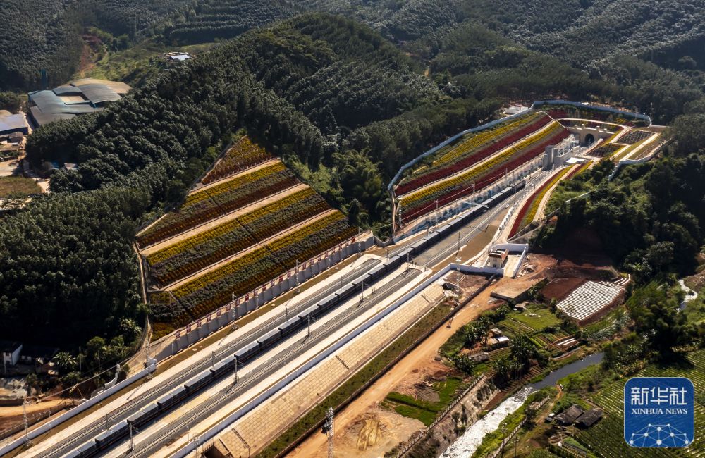 ↑12月4日,货物列车即将通过位于中老边境的友谊隧道(无人机照片)。