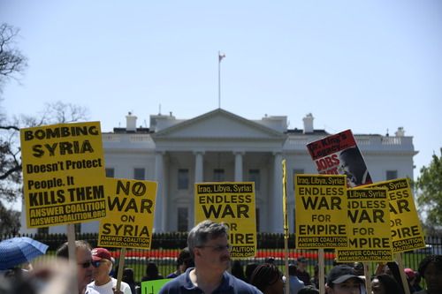 2018年4月14日,在美国华盛顿白宫北侧,人们手持标语抗议对叙利亚进行军事打击。新华社记者杨承霖摄