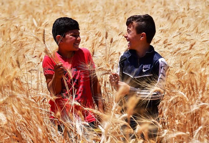 6月6日,叙利亚儿童站在首都大马士革的一处麦田里。新华社发(阿马尔·萨法尔贾拉尼摄)