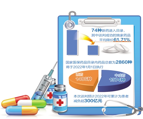 国家医保局近日公布2021年国家医保药品目录调整结果。本次调整中,共计74种药品新增进入目录,包括谈判调入的67种独家药品和直接调入的7种非独家药品,谈判成功的独家药品平均降价61.71%,另有11种临床价值不高的原目录内药品被调出。调整后,新版医保药品目录内药品总数2860种,将于2022年1月1日执行。