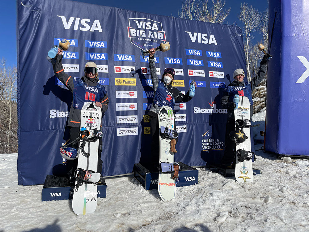 ↑冠军中国选手苏翊鸣(中)在颁奖仪式上。