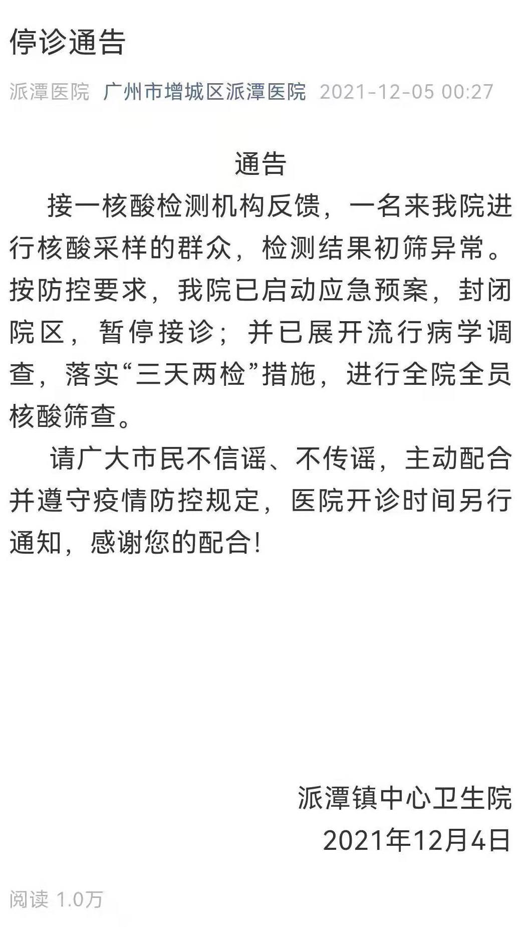 广东省广州市增城区派潭医院微信公众号发布停诊通告,通告称,接一核酸检测机构反馈,一名来派潭镇中心卫生院进行核酸采样的群众,检测结果初筛异常。按防控要求,该院已启动应急预案,封闭院区,暂停接诊;并已展开流行病学调查,落实“三天两检”措施,进行全院全员核酸筛查。请广大市民不信谣、不传谣,主动配合并遵守疫情防控规定,医院开诊时间另行通知,感谢您的配合。