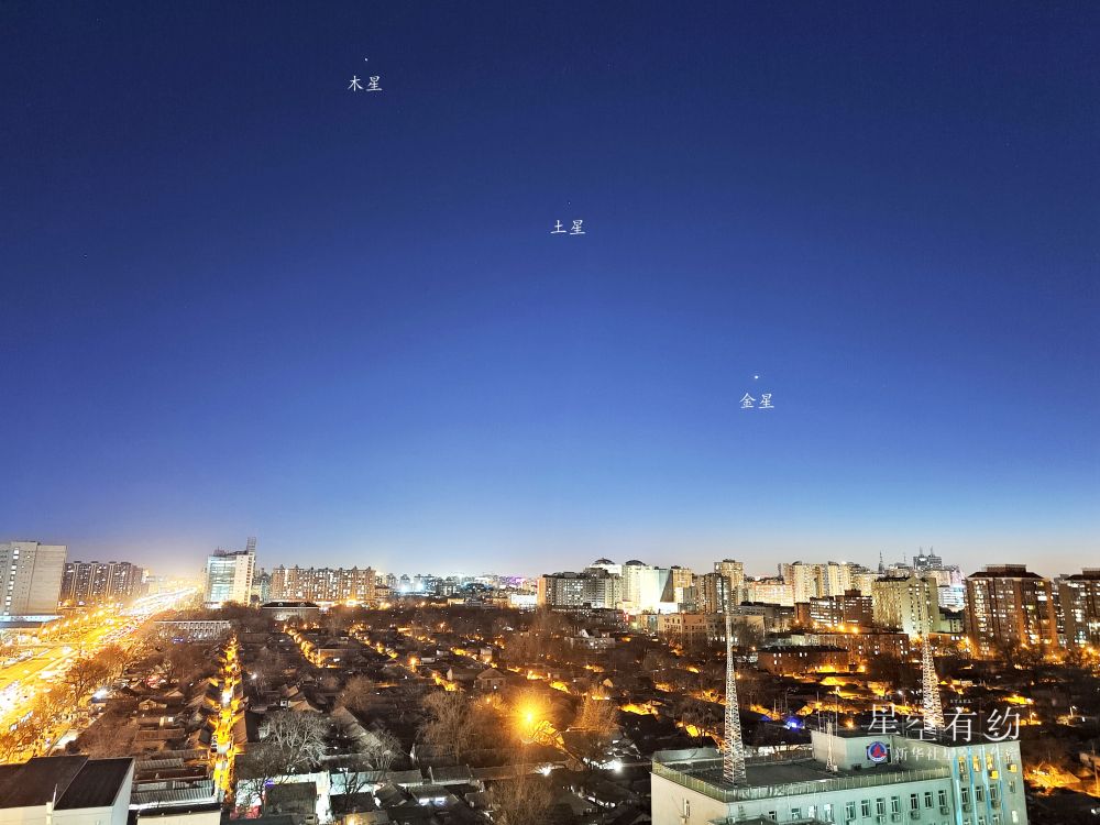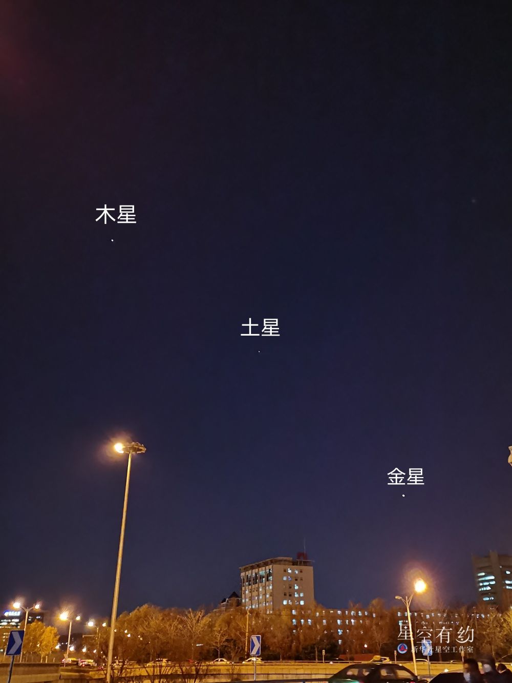 “这三颗星的高度由低到高依次是金星、土星和木星,其中金星最亮,木星次之,土星再次之。”天津市天文学会理事、天文科普专家修立鹏说。