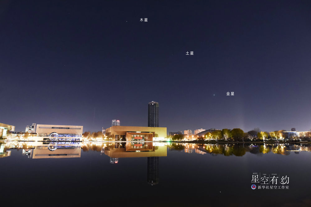 天津市天文摄影爱好者杨婧2021年12月2日在天津文化中心拍摄的“三星一线”。