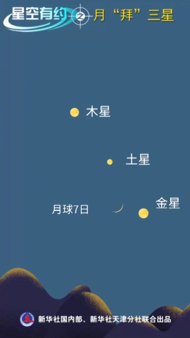 【#7日至9日天宇上演月拜三星#】天文科普专家介绍,12月7日、8日和9日的夜幕降临后,一枚弯月会近距离依次“拜会”金星、土星和木星,届时只要天气晴好,我国各地公众凭借肉眼就能观赏到这幕趣味天象。月球与这三颗明亮的行星究竟会碰撞出怎么样的火花呢?大家不妨拭目以待。(记者周润健,视频海报制作:胡彦竹) 新华社的微博视频