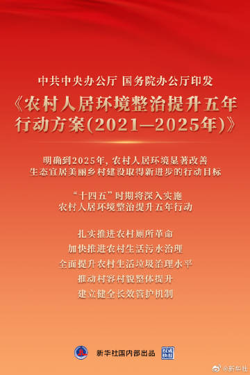 【#权威快报#|《#农村人居环境整治提升五年行动方案#(2021—2025年)》印发】近日,中共中央办公厅、国务院办公厅印发《农村人居环境整治提升五年行动方案(2021—2025年)》,5日正式向社会公布。明确到2025年,农村人居环境显著改善,生态宜居美丽乡村建设取得新进步的行动目标,是“十四五”时期进一步改善农村人居环境、加快建设生态宜居美丽乡村的行动指南。《行动方案》提出扎实推进农村厕所革命,加快推进农村生活污水治理,全面提升农村生活垃圾治理水平,推动村容村貌整体提升,建立健全长效管护机制。“十四五”时期将深入实施农村人居环境整治提升五年行动,全面提升农村人居环境质量,为全面推进乡村振兴、加快农业农村现代化、建设美丽中国提供有力支撑。(记者侯雪静、于文静,海报设计杨轶群)