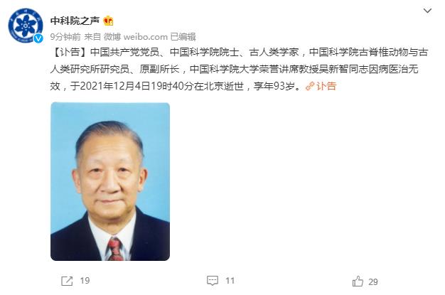 12月5日,中国科学院在其官方微博发布讣告:中国共产党党员、中国科学院院士、古人类学家,中国科学院古脊椎动物与古人类研究所研究员、原副所长,中国科学院大学荣誉讲席教授吴新智同志因病医治无效,于2021年12月4日19时40分在北京逝世,享年93岁。