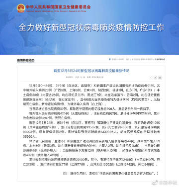 截至12月5日24时,据31个省(自治区、直辖市)和新疆生产建设兵团报告,现有确诊病例1060例(其中重症病例12例),累计治愈出院病例93507例,累计死亡病例4636例,累计报告确诊病例99203例,现有疑似病例2例。累计追踪到密切接触者1339086人,尚在医学观察的密切接触者35990人。