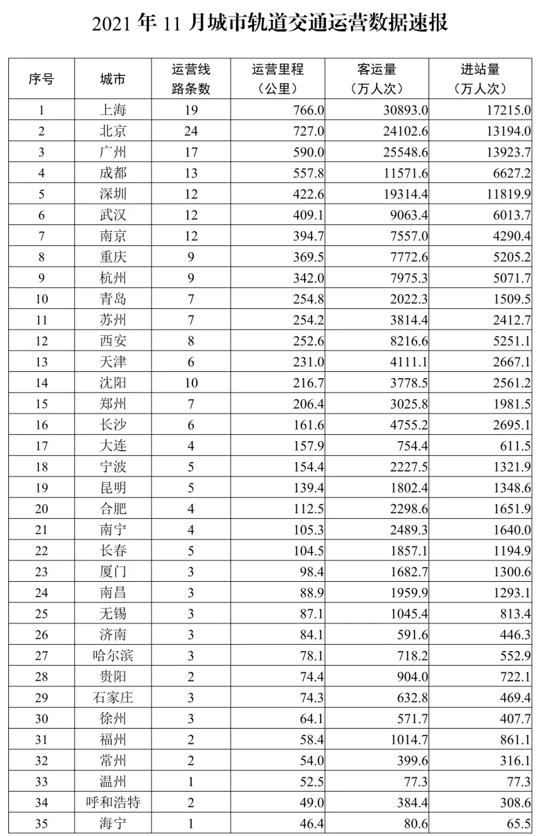 据交通运输部微信公众号消息,2021年11月,31个省(自治区、直辖市)和新疆生产建设兵团共有49个城市开通运营城市轨道交通线路250条,运营里程8116公里,实际开行列车266万列次,完成客运量19.7亿人次,进站量12亿人次,未发生运营安全责任事故。