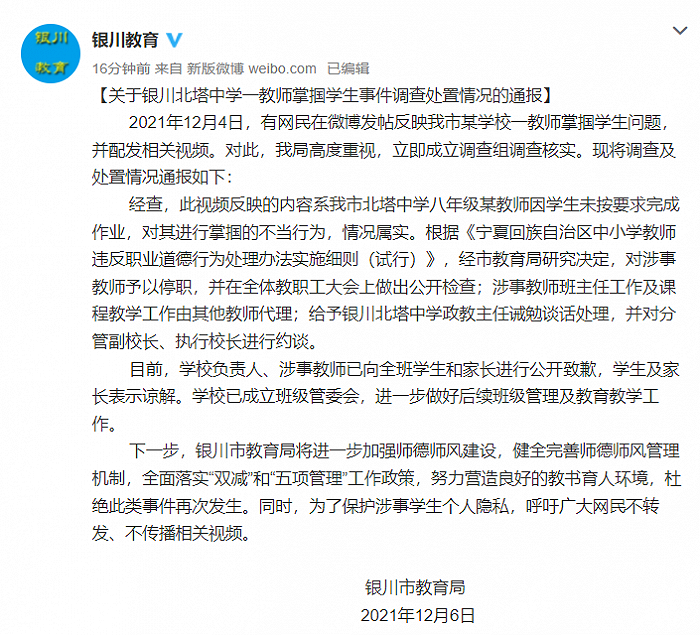 12月6日,银川教育局发布《关于银川北塔中学一教师掌掴学生事件调查处置情况的通报》。通报内容如下: