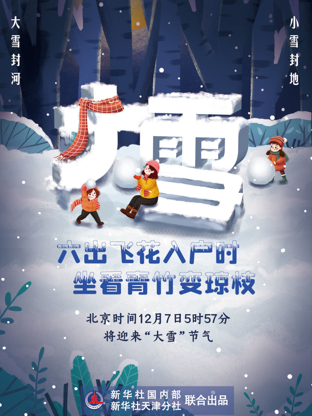 《2021年中国天文年历》显示,北京时间12月7日5时57分将迎来“大雪”节气,标志着仲冬时节开始。专家表示,此时节,我国越来越多的地区会迎来降雪,雪后气温下降,寒冷加剧,公众要注意防寒保暖,避免流感等疾病侵扰。详情>>>