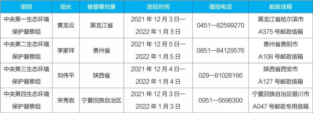 记者6日从生态环境部获悉,第二轮第五批4个中央生态环境保护督察组已经全部进驻,将对黑龙江、贵州、陕西、宁夏4个省(区)开展督察工作。进驻期间,各督察组分别设立专门值班电话和邮政信箱,受理被督察对象生态环境保护方面的来信来电举报,受理举报电话时间为每天8:00—20:00。详情>>>
