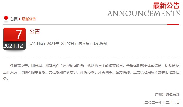 12月7日,广州足球俱乐部官网发布公告:经研究决定,即日起,郑智出任广州足球俱乐部一线队执行主教练兼球员。