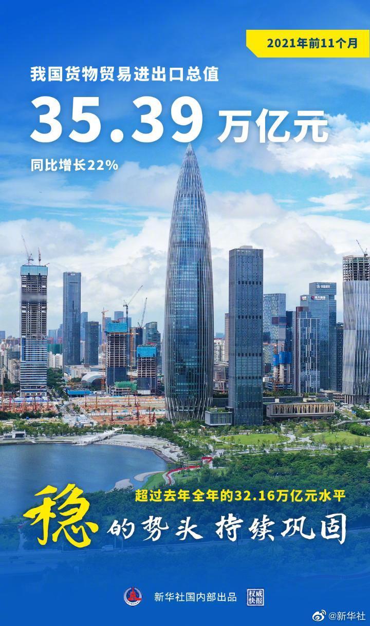 【权威快报丨我国前11个月货物贸易进出口总值超去年全年】海关总署7日发布数据,今年前11个月,我国货物贸易进出口总值35.39万亿元人民币,同比增长22%,超过去年全年的32.16万亿元水平,稳的势头持续巩固。(记者刘红霞,海报设计张晨光)