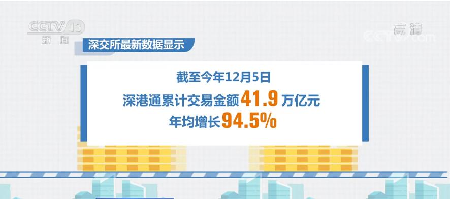 深交所最新数据显示,截至今年12月5日,深港通累计交易金额41.9万亿元,年均增长94.5%。目前,深股通在深市A股交易金额的占比为4.5%,港股通在香港股票市场交易金额的占比为6.8%。