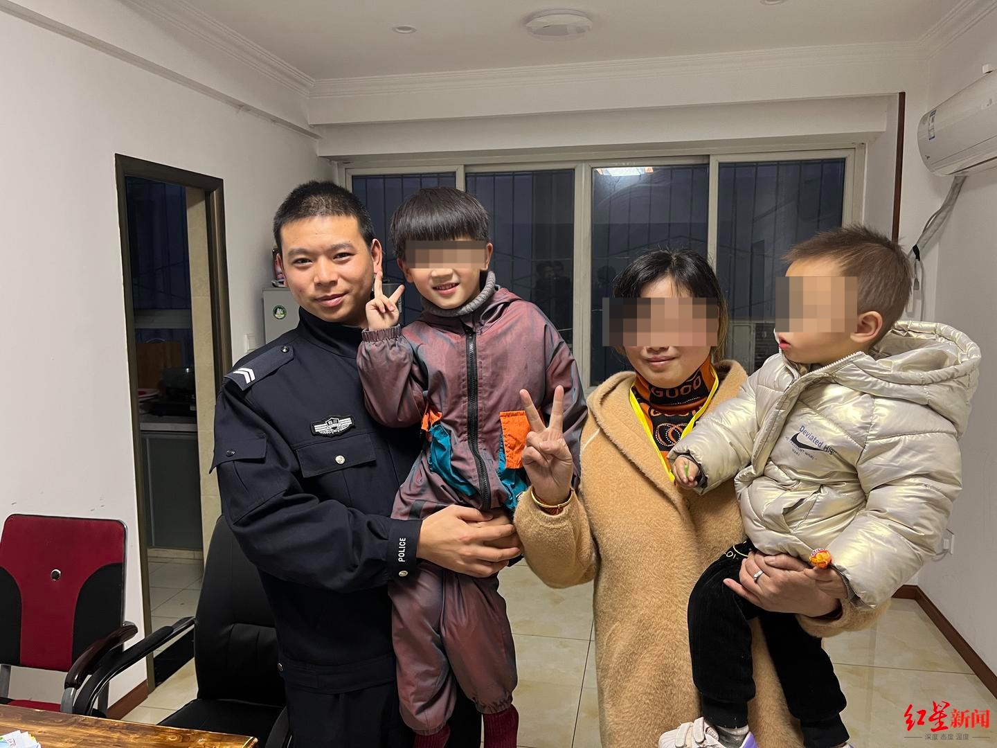 辅警王秋平与他救出的两个孩子及家长合影