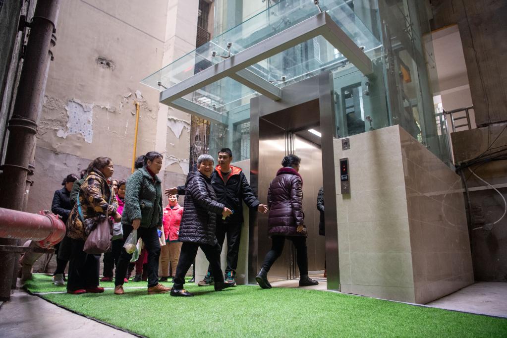 11月24日,中山二路社区居民搭乘“阳光电梯”。新华社记者唐奕摄