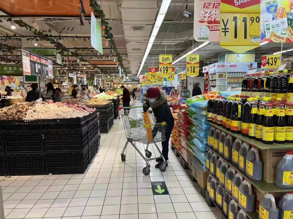12月6日,在镇海区的一家超市内,米面粮油等生活物资储备较为充足。(受访者供图)