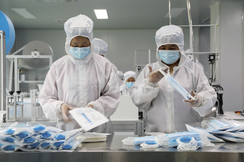 2021年3月26日,在甘肃临夏的医用口罩生产车间内,工作人员在加工生产医用口罩。(新华社记者 马莎 摄)
