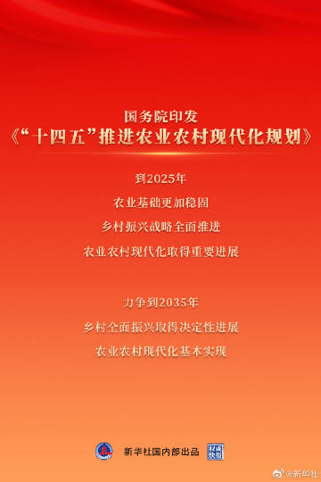 【#权威快报#|#推进十四五农业农村现代化#建设目标公布】农业农村部副部长邓小刚8日表示,近日国务院印发《“十四五”推进农业农村现代化规划》。规划提出,到2025年,农业基础更加稳固,乡村振兴战略全面推进,农业农村现代化取得重要进展。梯次推进有条件的地区率先基本实现农业农村现代化,脱贫地区实现巩固拓展脱贫攻坚成果同乡村振兴有效衔接。力争到2035年,乡村全面振兴取得决定性进展,农业农村现代化基本实现。(记者于文静、王悦阳,海报设计杨轶群)