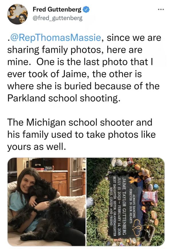 弗雷德·古腾堡的女儿杰米·古腾堡2018年在佛罗里达州的帕克兰校园枪击案中丧生。他写道:“既然分享的是全家福,下面是我的。其中一张是我为杰米拍下的最后一张照片,另一张则是她安葬的地方。密歇根州校园枪手和他的家人之前也像你们家这么拍照。”