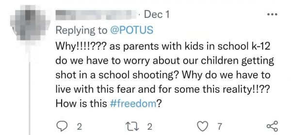正如一名愤怒的家长在拜登推特下的质问:“为什么?作为学生家长,我们要担心自己的孩子会有天在校园枪击中丧生?我们为什么要活在这种恐惧和现实中?这到底是怎样的一种‘自由’!”