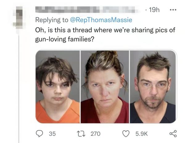 有人在马西推特下贴出这名高中生和他父母的照片,说:“这是一个线索,另一个爱好枪的家庭。”