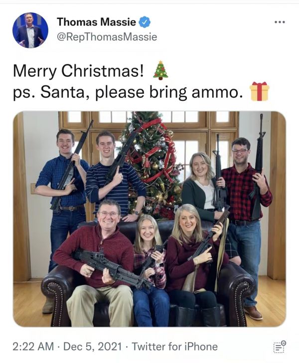 12月5日,美国肯塔基州共和党籍众议员托马斯·马西在推特上发布了一张庆祝圣诞的全家福。照片中无论男女老少,每个人手里都拿着一把货真价实的枪,脸上挂着灿烂的笑容。