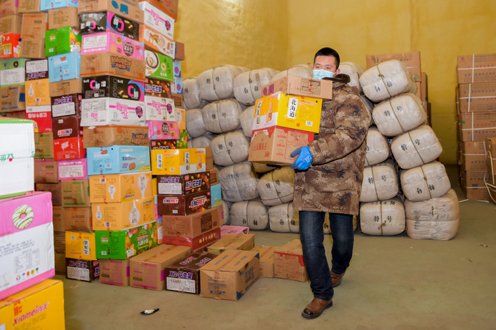 一辆装满防护服的大货车刚在仓库门口停稳,十余名装卸工立刻推着小车开始搬运。在另一间仓库里,几名装卸工抱着方便食品小跑着往厢式货车上装货,这些物资即将配送到各个隔离点。