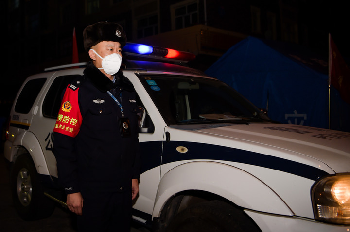 深夜安静的街道上亮起了两盏车灯,灯光中是正在巡逻的满洲里市公安局道南派出所民警王满。王满和同事负责新世界小区B区的外围管控工作,看到街边有商铺亮着灯,他站在门外大声叮嘱里面的人千万不能出门,同事在他身后几米处用车灯给他照明。