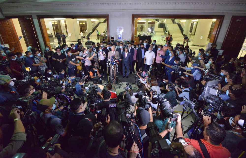 2020年7月28日,纳吉布(中)离开吉隆坡高等法院时对媒体讲话。(新华社发,张纹综摄)
