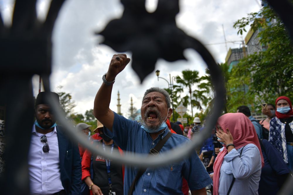 2020年7月28日,纳吉布的支持者在吉隆坡高等法院外高喊口号。(新华社发,张纹综摄)