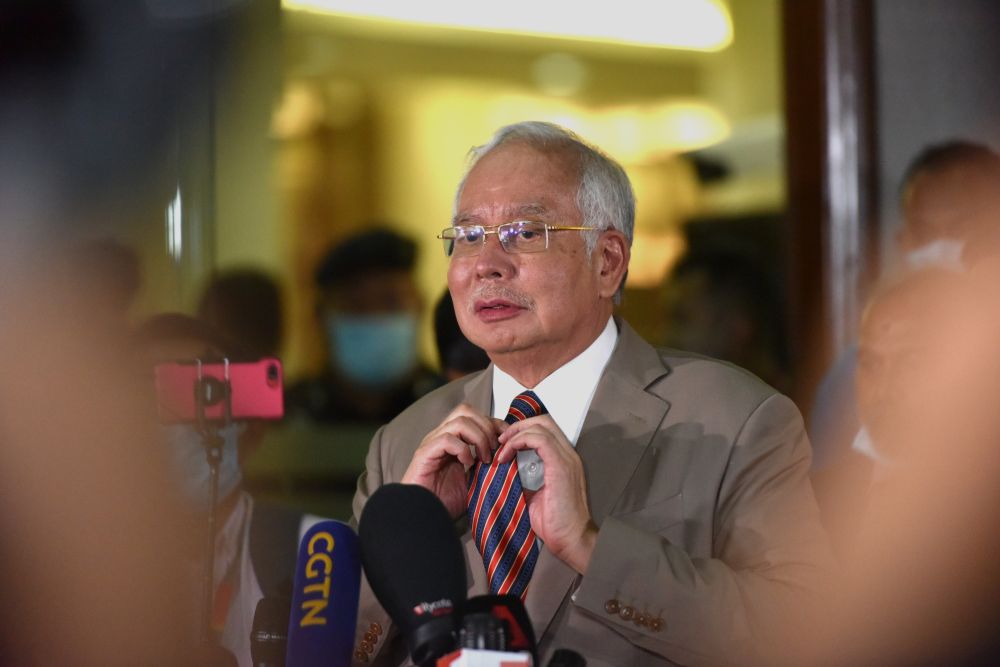 2020年7月28日,马来西亚吉隆坡高等法院裁定前总理纳吉布在所涉“一马公司”前子公司SRC国际公司的案件中所涉7项罪名全部成立。图为纳吉布离开法院时对媒体讲话。(新华社发,张纹综摄)